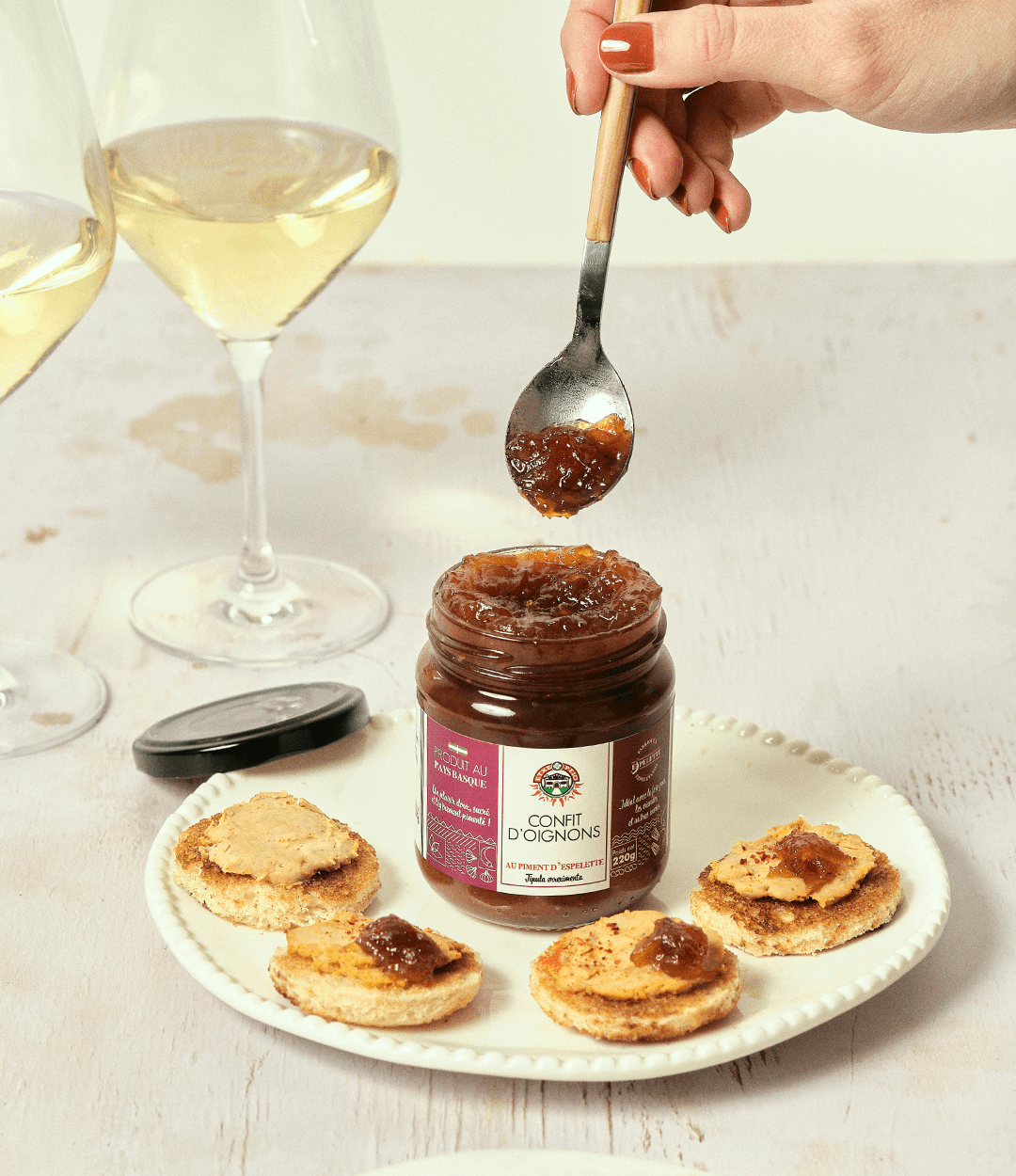 Notre recette de confit d’oignon est produite à partir de matières premières de qualité. Nous préfèrerons utiliser des oignons sucrés et doux de nature, et y ajouter une pointe de piment d’Espelette, le tout fabriqué au cœur du Pays Basque, dans notre conserverie à Espelette !