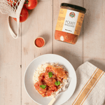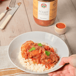 Cuisiné avec tout notre savoir-faire artisanal de beaux morceaux de poulet ; des tomates, des oignons et quelques piments doux.