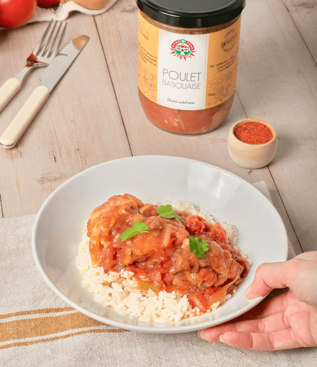 - Ingrédients : Viande de poulet (54,5%), piperade (tomates, oignons, piments verts doux, poivrons verts, concentré de tomates, sucre, fécule de pomme de terre, huile de tournesol), ail, sel, poivre, piment d’Espelette AOP.