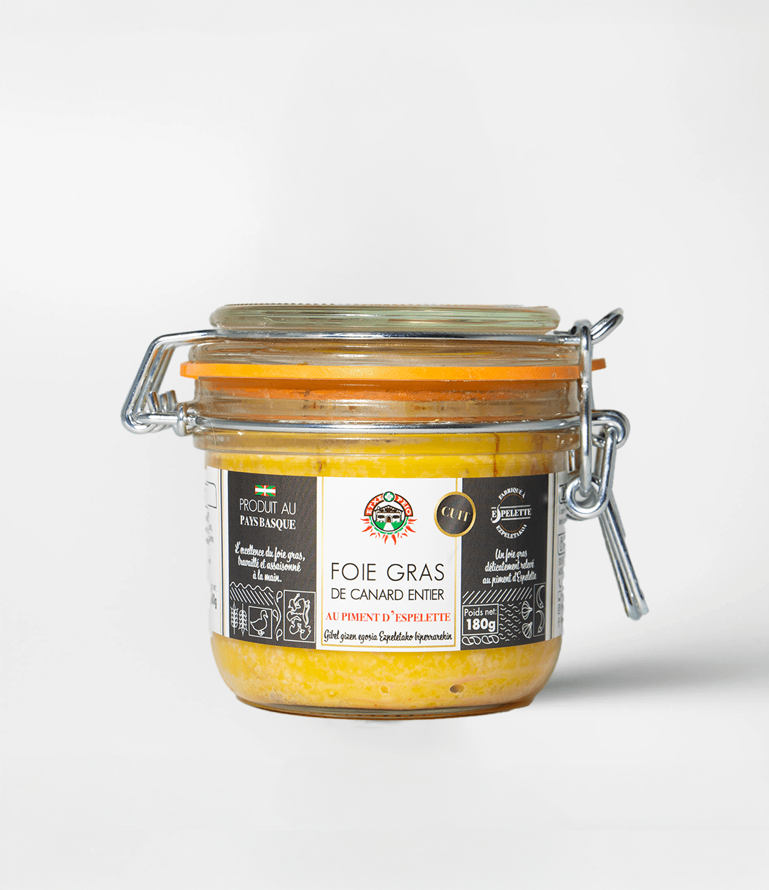 - Ingrédients : Foie gras entier de canard, sel, poivre blanc, sucre, piment d’Espelette AOP (0,2%).