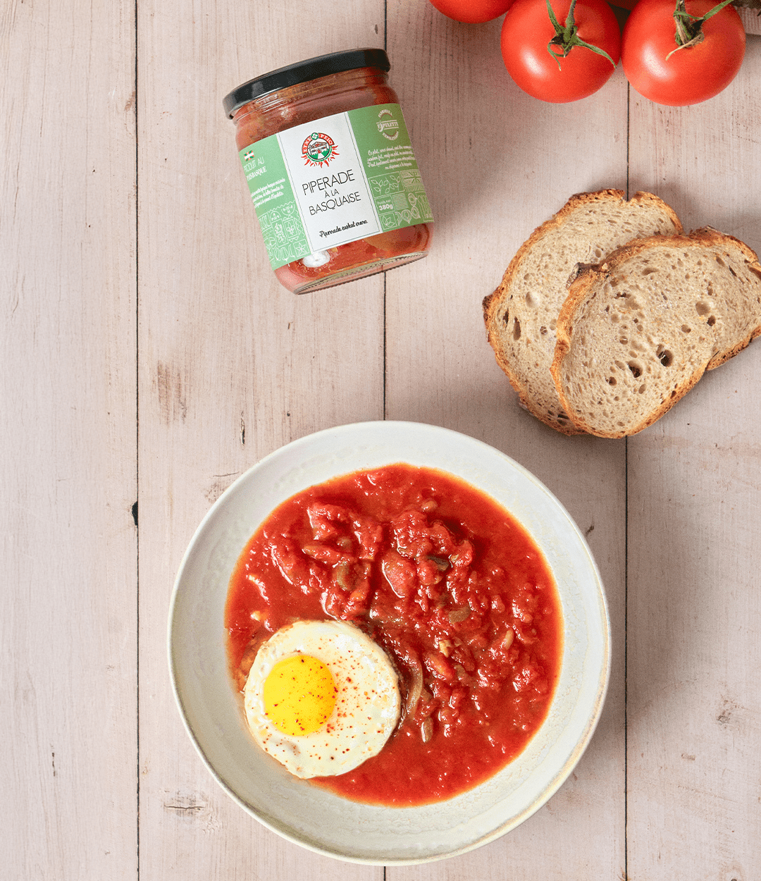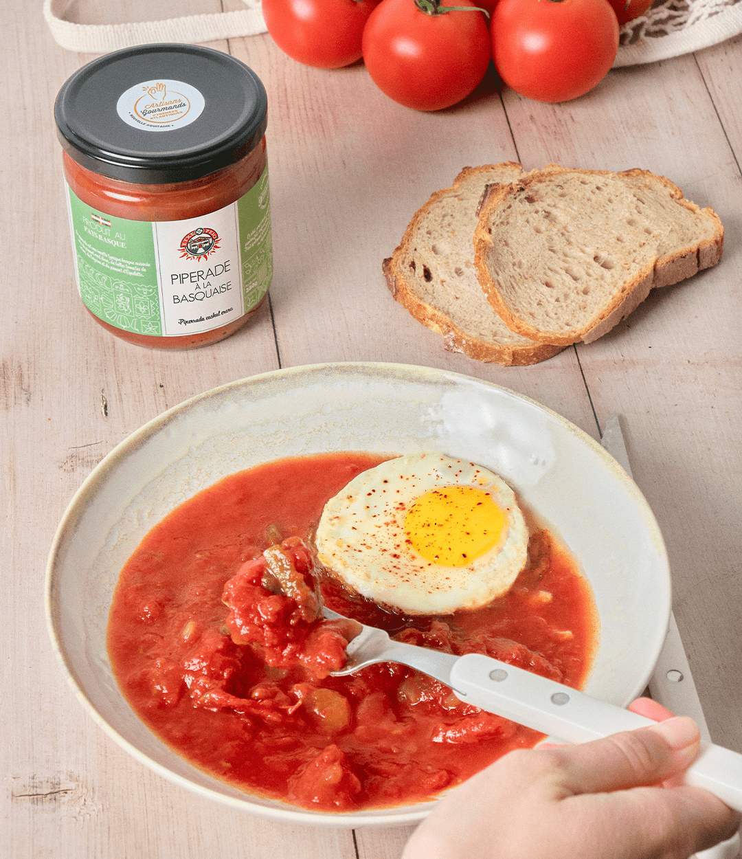 Authentique recette basque, notre piperade est réalisée avec des légumes bien roussi qui libèrent leurs arômes sucrés et donne à la piperade ce goût caractéristique.